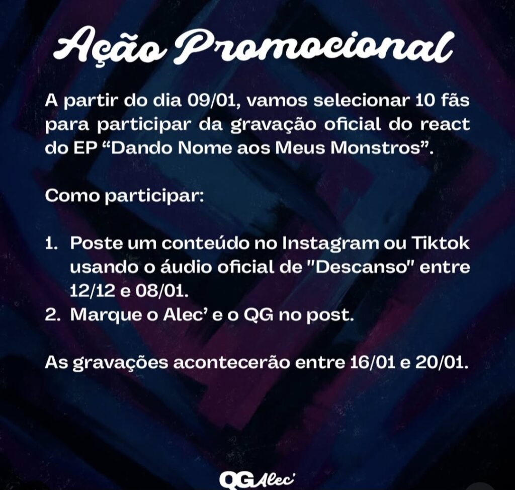 De acordo com a publicação, a promoção vai até o dia 8 de janeiro de 2026. Cada postagem feita com o áudio original da faixa entra automaticamente no sorteio para selecionar 10 fãs que terão a oportunidade de gravar reações ao EP completo intitulado “Dando nome aos meus monstros”.