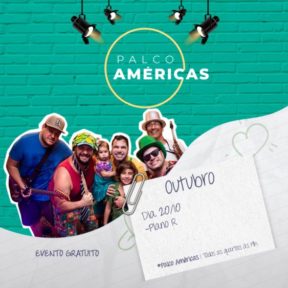 E ainda tem mais! Todas as quartas, às 19h, o projeto Palco Américas dedicará seus shows musicais para as famílias curtirem juntos. No dia 20/10, será a vez do grupo Plano R, que faz karaokê com banda; e em 27/10, encerra com o Baile da Tia Gê, que levará a todos muita música, arte e diversão.