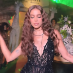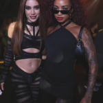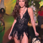 - Look da Anitta: All black com transparências, pedraria, top de tiras com decote, barriga à mostra e calça no mesmo estilo – puro brilho e recortes ousados. Ela chegou sorridente, posou pros paparazzi e ainda carregou uma máscara na mão (detalhe que viralizou). No segundo dia (domingo), continuou arrasando com produções diferentes.