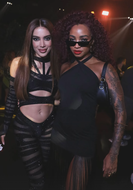 - Look da Anitta: All black com transparências, pedraria, top de tiras com decote, barriga à mostra e calça no mesmo estilo – puro brilho e recortes ousados. Ela chegou sorridente, posou pros paparazzi e ainda carregou uma máscara na mão (detalhe que viralizou). No segundo dia (domingo), continuou arrasando com produções diferentes.