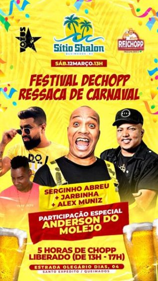 O evento que terá inicio ás 09h do dia 12 de março, contará com a participação do cantor Anderson Leonardo, do Grupo Molejo, além de Jarbinha, ex-Quinto Segredo, Alex Muniz, e um grande time de DJs que irá assumir a animação da festa. Além disso, a festa contará com a presença do cantor Serginho Abreu, um dos mais queridos nomes do sertanejo brasileiro atual.