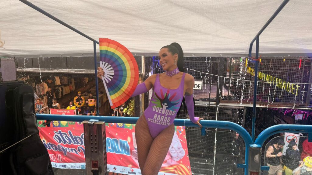 Vestida em tons de roxo — cor que simboliza o Fevereiro Roxo, mês de conscientização sobre as doenças raras —, Carla usou um body cavado e justo ao corpo, com recortes modernos e estampa marcante, valorizando a silhueta e reforçando a mensagem de visibilidade e empatia. O visual foi complementado por luvas longas no mesmo tom e um colar tipo choker com a palavra “RARA”, reforçando, de forma direta e potente, o apoio à causa e a importância de dar visibilidade às doenças raras também neste momento.