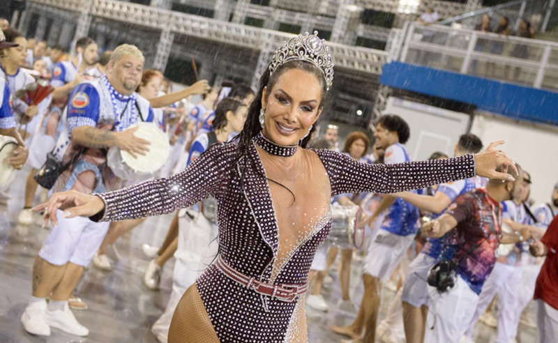 Camila Prins aposta em look com 10 mil cristais para ensaio no Anhembi