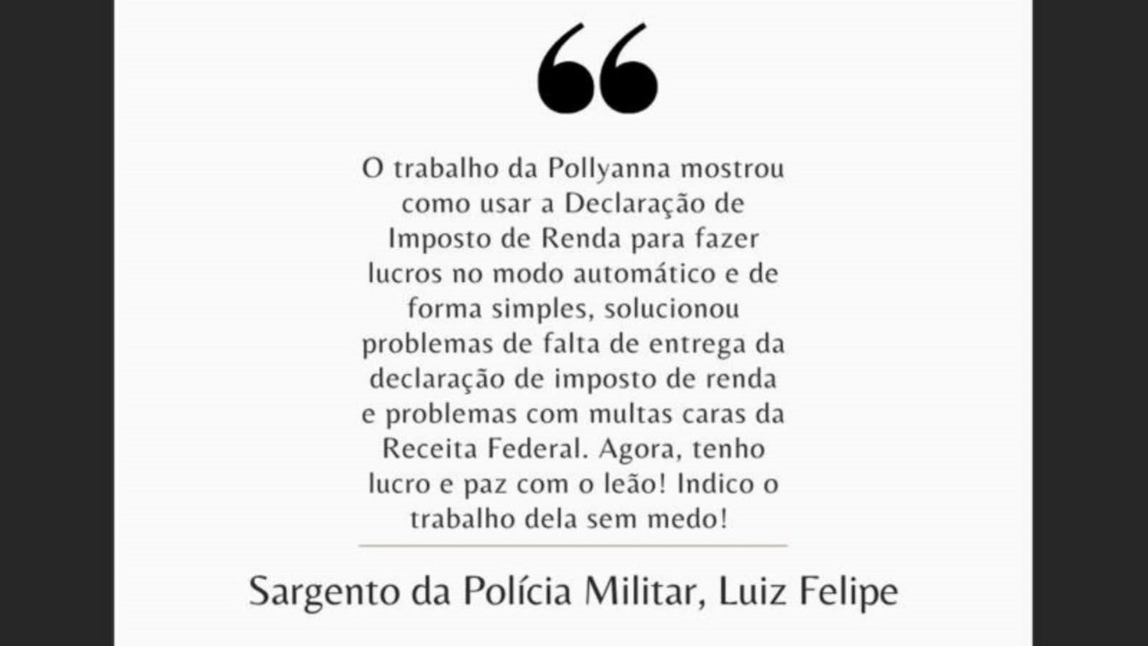 “Eu busquei conhecimento e descobri uma maneira diferente de viver: investindo na bolsa de valores. Com apenas 20 minutos por semana, vi meu dinheiro crescer de forma consistente, recebi restituições do governo e encontrei uma maneira segura de intensificar meus ganhos”, revela Pollyana.