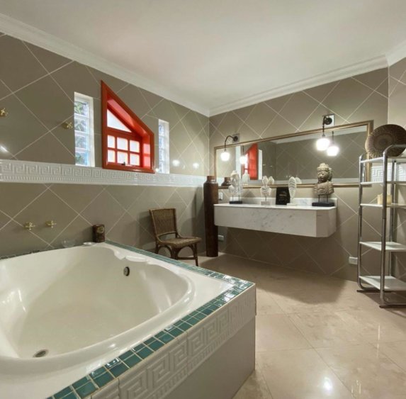 A suíte tem uma lareira maravilhosa para esquentar seus hospedes no frio de Campos do Jordão, que chega a fazer -2 Graus, em alta temporada de Inverno, e ainda banheira, cama extra grande, lençóis 600 Fios, Amenities Loccittane , jogo de cama Trousseau e para acompanhar um excelente vinho italiano e água San Pellegrino