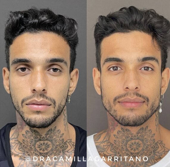 O procedimento de harmonização facial masculina tem como objetivo ajustar pequenas proporções no rosto dos homens, tornando a face mais harmônica e equilibrada. As regiões mais trabalhadas normalmente são a mandíbula e o mento (queixo), além do zigomático e do sulco nasolabial (o famoso “bigode chinês”). Têmporas, nariz e lábios também podem ser opções, dependendo do caso.