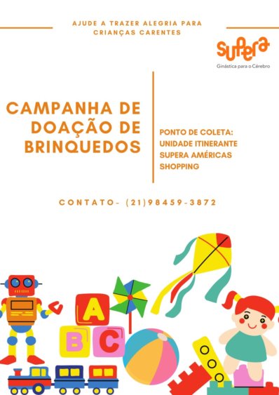 Para fazer a diferença na vida de diversas crianças carentes, o Américas Shopping, junto à equipe Supera Recreio, lança campanha de doação de brinquedos, para tornar a vida da meninada mais feliz no Dia das Crianças. Para contribuir, basta doar algum brinquedo novo ou usado, em bom estado, no espaço Supera, até o dia 10 de outubro.