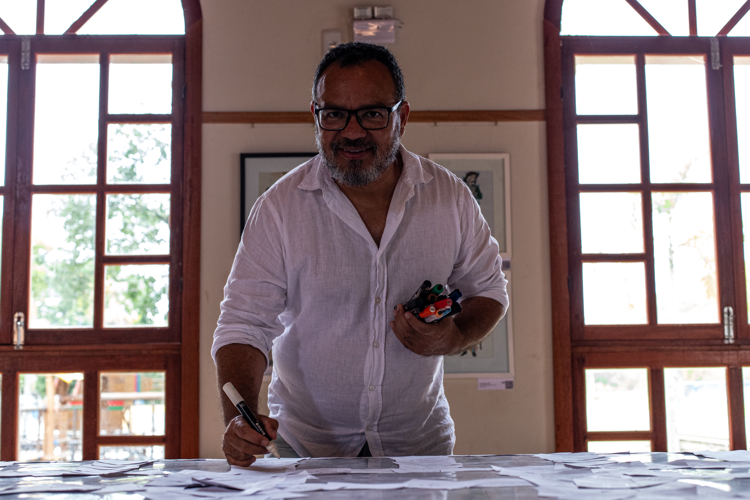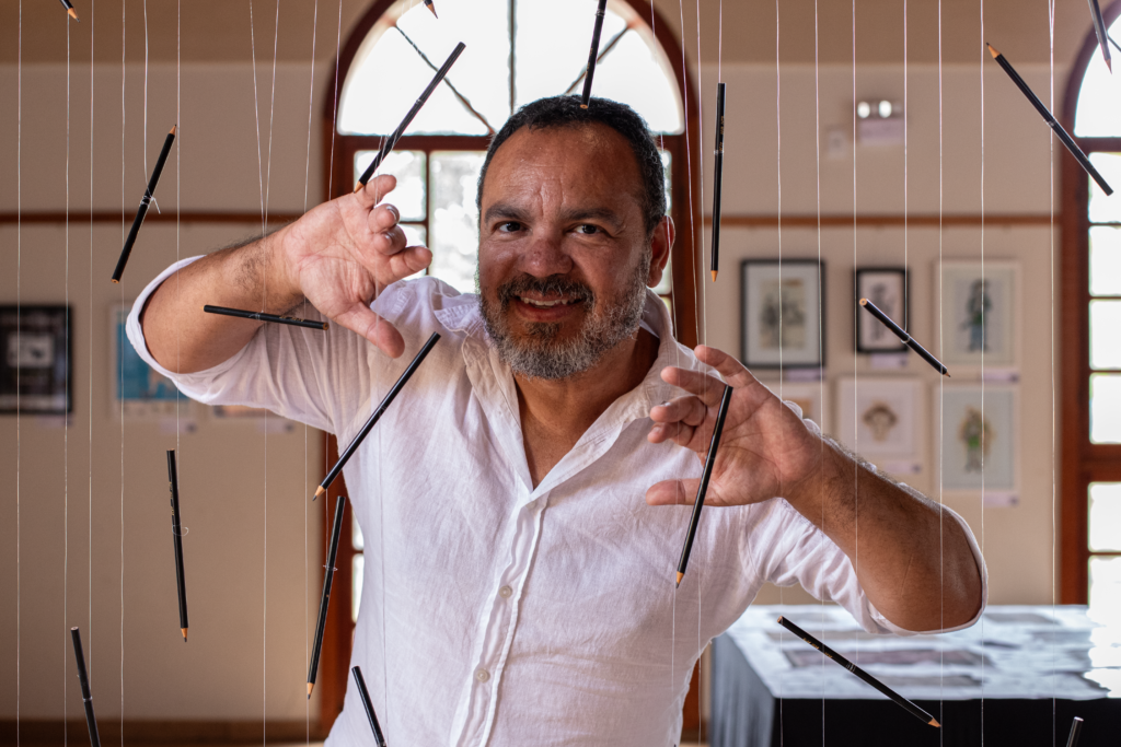 A cenografia da exposição é assinada por Rodrigo Pontes, artista plástico com mais de 20 anos de atuação e referência em exposições e projetos de formação artística. Seu olhar transforma o espaço expositivo em uma extensão das telas, ampliando a imersão do visitante no universo criativo do artista.