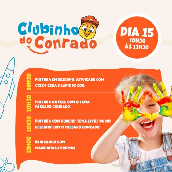 No dia 15, os pequenos poderão curtir atividades que estimulam a criatividade e a imaginação, como massinhas, formas variadas, pinturas em lápis de cor, giz de cera e guache, e até pinturas na pele com o tema “Pássaro Conrado”.