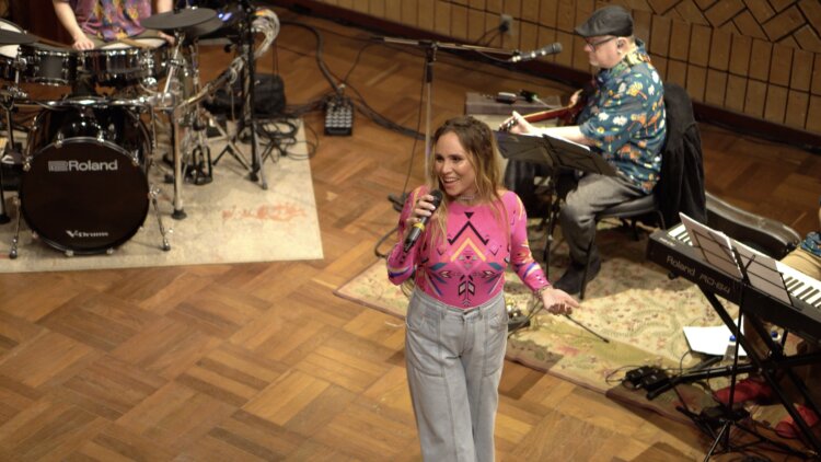 Flavia sobe ao palco junto a banda Crazy Joe no dia 18 de maio na galeria Bianca Boeckel em São Paulo.