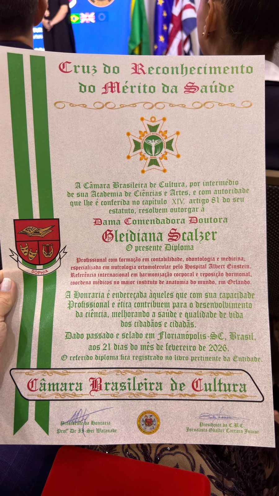 A médica Gleidiana Scalzer, reconhecida no Brasil e no exterior como Dra. Shape, recebeu da Câmara Brasileira de Cultura o título de Dama Comendadora — uma das mais altas honrarias concedidas a profissionais da saúde.