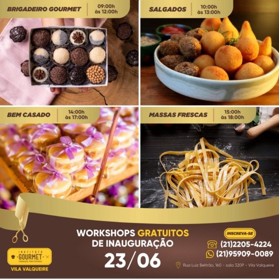 Com Workshops gratuitos, das 09 às 18 horas sendo o de Brigadeiro Gourmet (das 09 às 12), salgados (das 10 às 13), Bem Casado (das 14 às 17) e Massas Frescas (das 15 às 18). As turmas fechadas começarão a ter aulas a partir do dia 07 de julho, das 18 às 22 horas, podendo abrir novos horários. Com 08 turmas fechadas, de imediato, os cursos oferecidos são: Confeiteiro Profissional 2; Cozinheiro Profissional 1; Chef Mix 1 e Cozinheiro Funcional e Fit 1. Com novas especializações no próximo semestre.