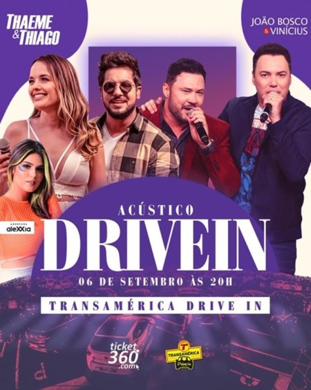 No domingo, dia 06 de setembro, João Bosco e Vinícius e Thaeme e Thiago sobem ao palco do Transamérica Drive In, em Barueri, São Paulo, a partir das 20h. As duplas, que há anos possuem uma relação de amizade, prometem uma apresentação com boas risadas e muita animação e alegria. O show também terá transmissão pela Rede Brasil de Televisão e no canal oficial de ambas as duplas, no YouTube.