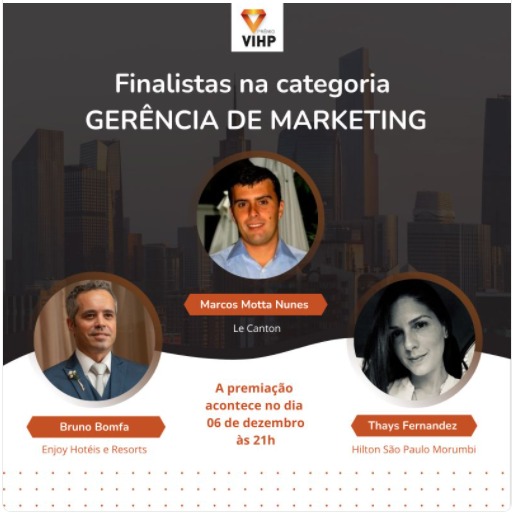 O Le Canton, o mais incrível resort da Região Serrana do Rio de Janeiro, fecha 2021 com mais um reconhecimento. Pela primeira vez, o gerente executivo de vendas e marketing Marcos Motta Nunes concorre ao Prêmio VIHP (Very Important Hotel Professional) na categoria Gerência de Marketing. O evento, organizado pelo Hotelier News, site de notícias sobre o setor hoteleiro, em parceria com a QI Profissional, chega à 7º edição. Será realizado dia 6 de dezembro, às 21h, no Novohotel Morumbi, em São Paulo, em formato híbrido. O prêmio retorna após intervalo de cinco anos.