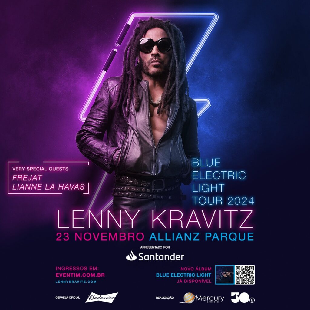 Escritor, produtor, multi-instrumentista vencedor de quatro prêmios GRAMMY®, Lenny Kravitz traz para São Paulo a turnê mundial Blue Electric Light Tour 2024, que já passou por Alemanha, Noruega, Bélgica, França, Itália, Suíça e Grécia, além de cinco datas em Las Vegas, com apresentações avaliadas como um retorno surpreendentemente maduro, versátil e de afirmação da vida. O artista tem passagem confirmada pelo Brasil no dia 23 de novembro, no Allianz Parque, em São Paulo. Em uma coprodução da 30e e Mercury Concerts,  apresentado pelo Santander Brasil e com patrocínio da Budweiser, o espetáculo terá duas duas atrações de abertura: Lianne La Havas e Frejat. Os ingressos estão disponíveis no site da Eventim.