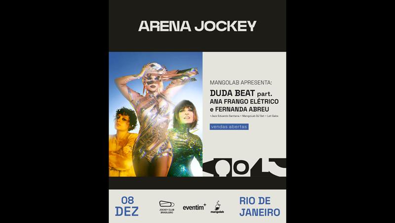 Ano após ano, a programação cultural do Arena Jockey embala as festividades de final de ano com apresentações de grandes nomes da MPB, além de um evento para o Ano Novo. A programação deste ano está confirmada para acontecer entre os dias 31 de outubro e 31 de dezembro e, ao longo desta festa, recebem a “Noite MangoLab”. No dia 08 de dezembro (domingo), acontece uma nova MangoLab Apresenta, com o show de Duda Beat part. Fernanda Abreu e Ana Frango Elétrico, além das performances de Jazz, com Eduardo Santana, o MangoLab DJ Set e Let Gabs. Ingressos disponíveis aqui!