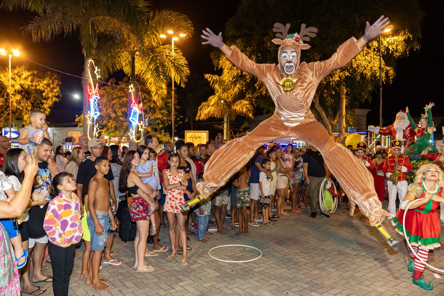 Durante o cortejo, personagens natalinos circularam pela praça e interagiram com as famílias, ampliando a movimentação no espaço e estimulando o fluxo turístico na região central de Barra de São João.
