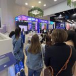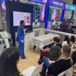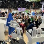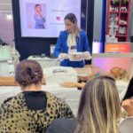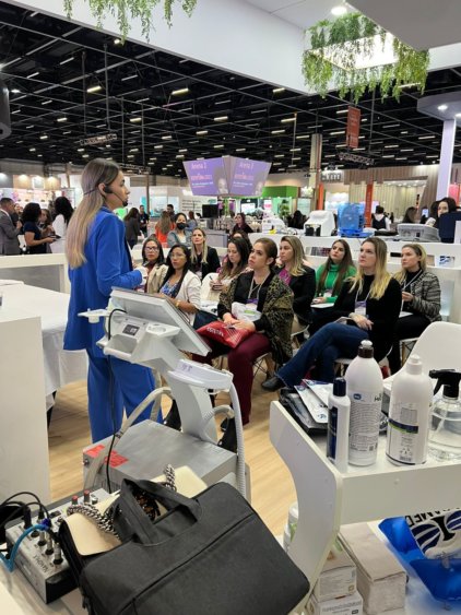 O estande ficou pequeno, vários profissionais de toda parte mundo estavam ali assistindo a palestra. Todas muito concentradas, anotando tudo que a esteticista estava falando.