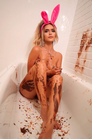 Ostentado seu shape slim, a modelo internacional Karenn Richet entrou no clima da Páscoa e posou de coelhinha sexy. De calcinha fio dental e blusinha branca, a loira preparou sua própria receita na cozinha e depois lambuzou seu corpo com muito chocolate em uma banheira.