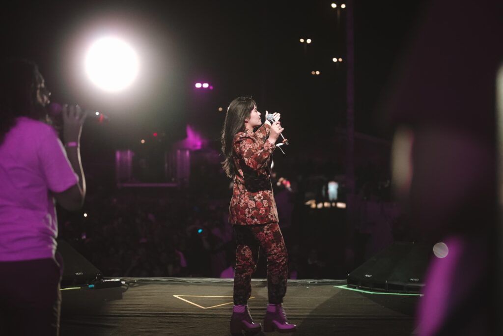 A cantora apresentou suas músicas já conhecidas do grande público e releitura de canções como “Teu Amor Não Falha” e “Ele vem me buscar”.
