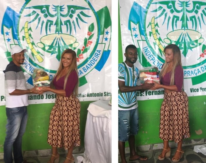 Mesmo com as atividades paradas devido à pandemia do coronavírus, a Rainha de Bateria Patrícia Barros está cada vez mais próxima de sua comunidade da Independente Praça da Bandeira. No último final de semana, a beldade se reuniu com integrantes da escola para a realização da entrega das cestas básicas.