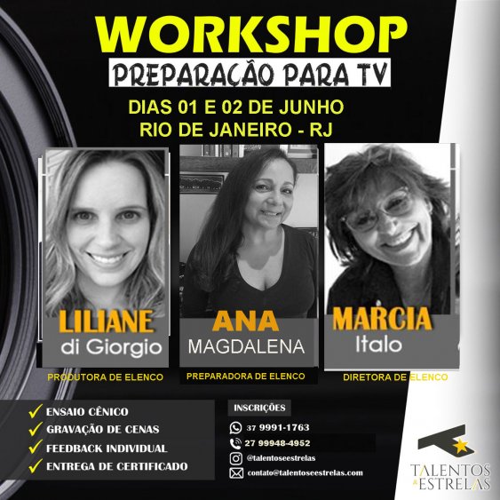 No começo do mês de junho, vai estar pela primeira vez no Rio de Janeiro, o workshop de preparação para televisão, liderado pelas produtoras de elenco Liliane Di Giorgio, Ana Magdalena e pela diretora de elenco Márcia Italo.