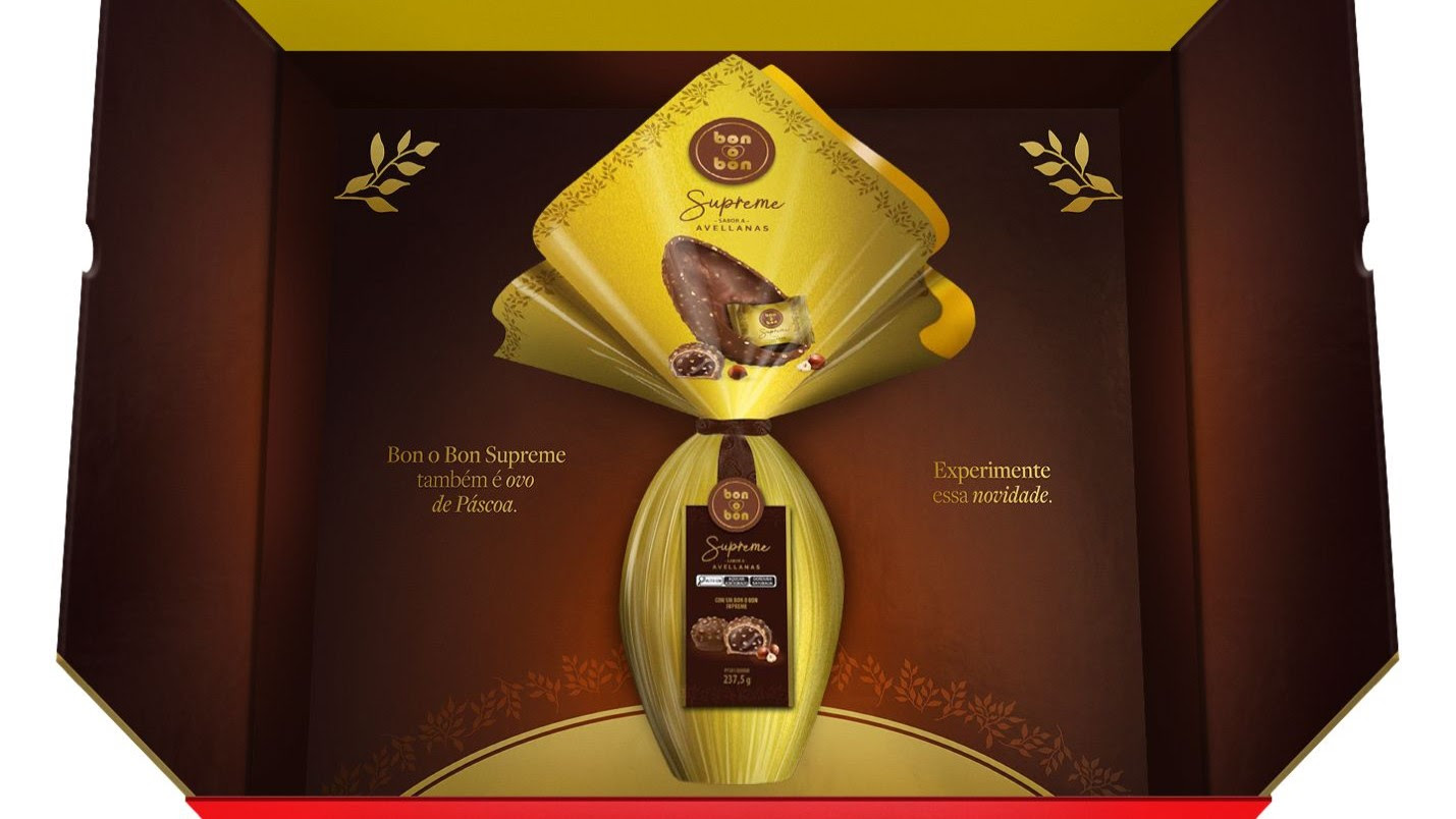 O clássico Bon o Bon, da Arcor, apresenta bombom em forma de ovo de chocolate no press kit com a nova linha Supreme – Créditos: faro.ag