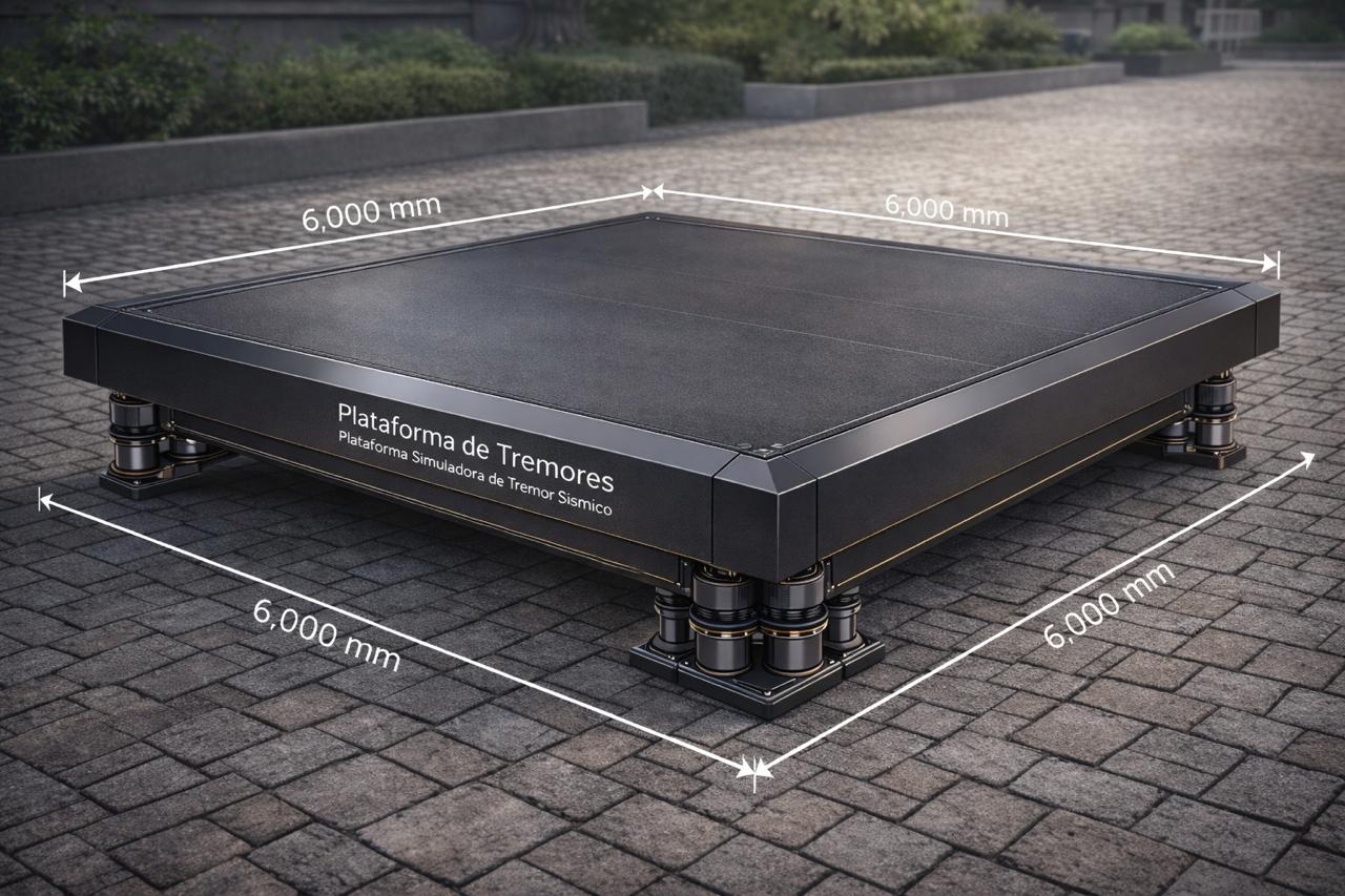 A plataforma é capaz de simular ondas sismicas primárias (P) e secundárias (S), possibilitando análises detalhadas do comportamento estrutural sob diferentes níveis de intensidade, frequência e aceleração.