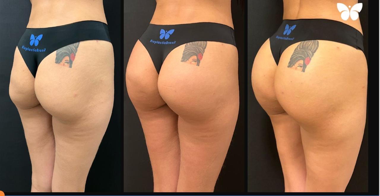 Procedimento com PMMA usado na reparação de sequelas em glúteos após retirada de prótese de silicone (contratura capsular e seroma). Seguindo protocolo rigoroso que pode levar de um ano a um ano e meio para conclusão.